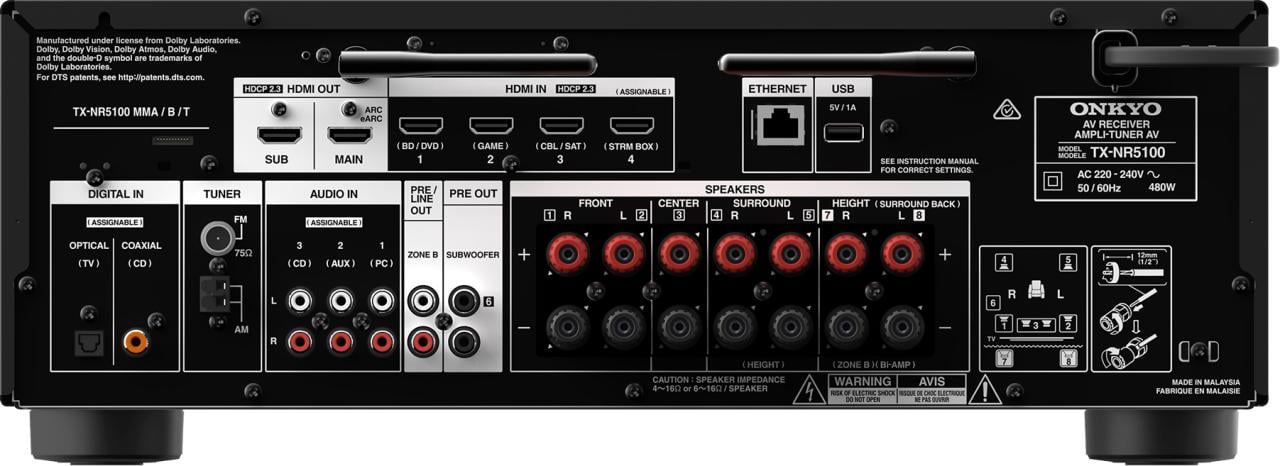 Конструкция дискретного усилителя обеспечивает в лучшем случае мощность 150 Вт на канал. Наслаждайтесь полноценным объемным звуком Dolby Atmos или DTS: X или воспользуйтесь преимуществами виртуального канала Height creative Dolby Atmos Height Virtualizer и функциями DTS Virtual: X, чтобы насладиться достоверным 3D-звучанием, если у вас нет отдельных потолочных динамиков.