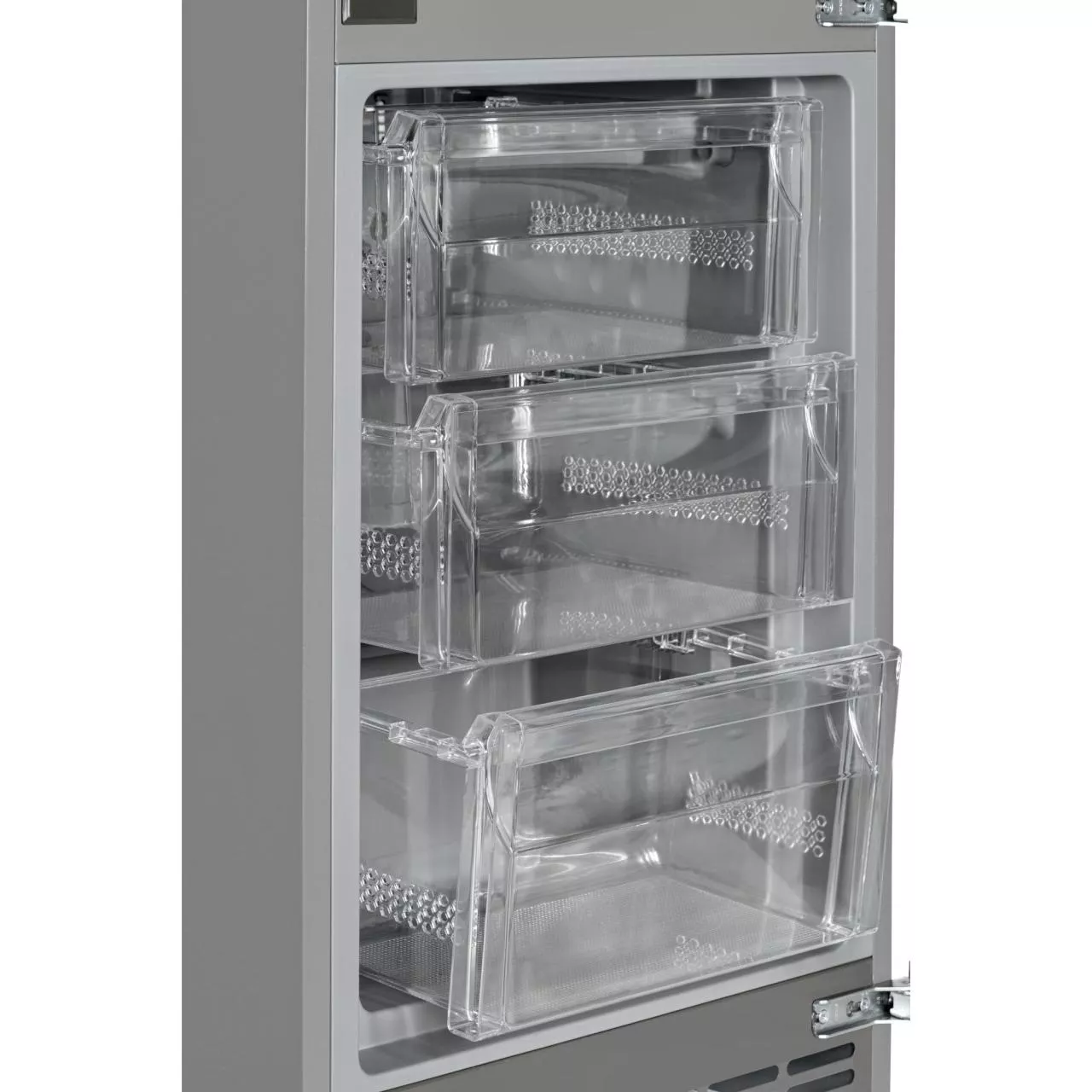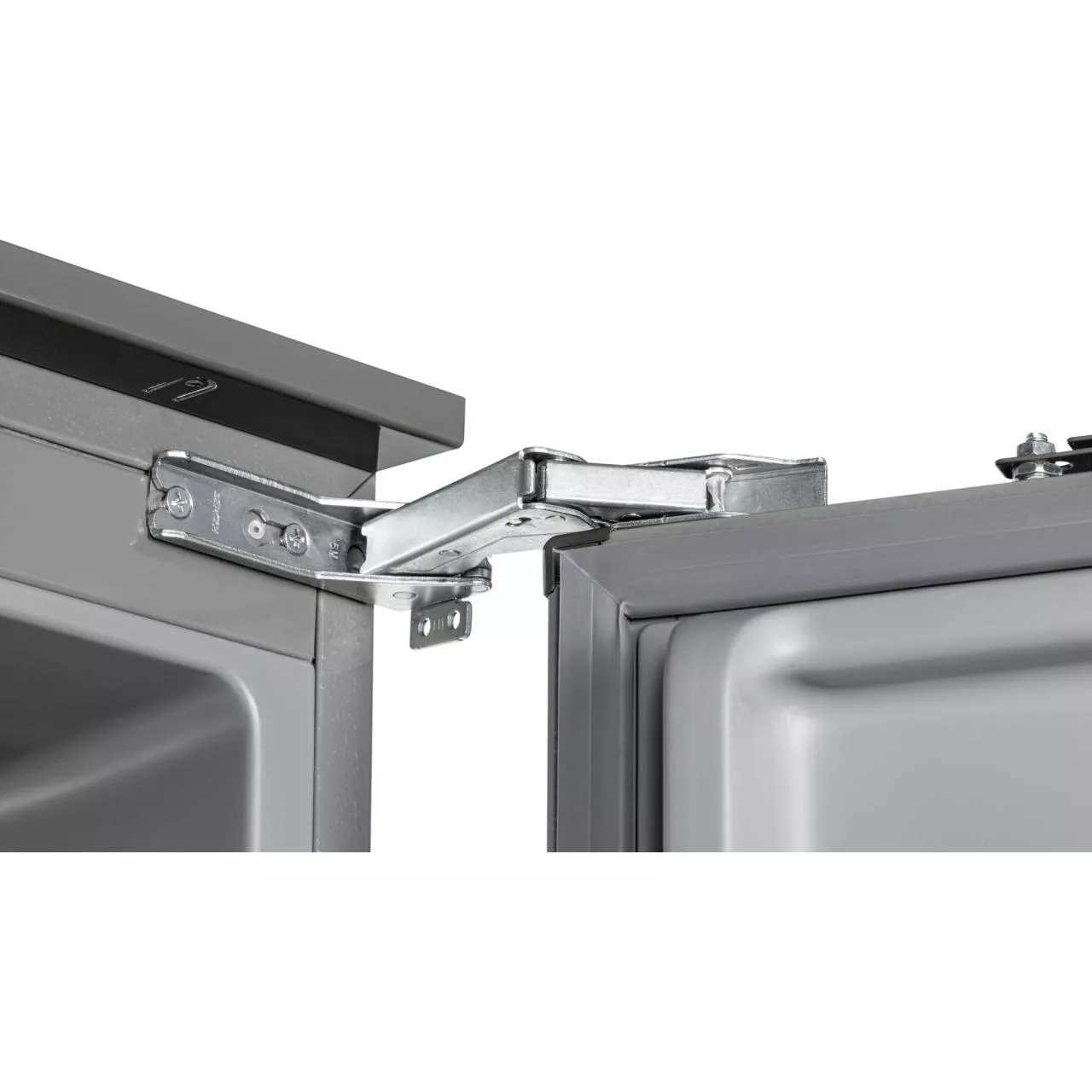 Холодильник имеет жесткую систему крепления фасадов. При таком монтаже фасады не связаны с корпусом шкафа и не предполагают наличие дополнительных петель. Конструкция не ограничена углом открывания и не имеет зазоров, в которых может скапливаться пыль и грязь.
